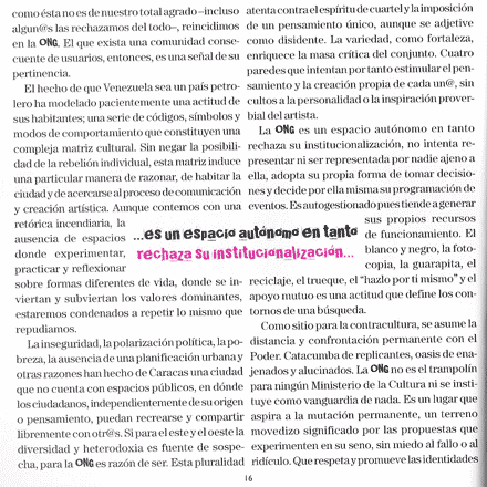En el país de la renta petrolera hay quien apuesta a la independencia. Mis buenos amigo/as de la Organización Nelson Garrido (ONG) me pidieron hace un buen tiempo un texto para su libro-catálogo sobre su experiencia, uno de los pocos espacios en Caracas que puede mostrar con orgullo el rótulo de «alternativo». Recientemente han editado «La ONG: Más allá de la fotografía», en una edición preciosa que venden a un precio super solidario. Les dejo mi aporte, a ver si alegro curiosidad por esa casa amarilla en Las Acacias. http://www.organizacionnelsongarrido.com