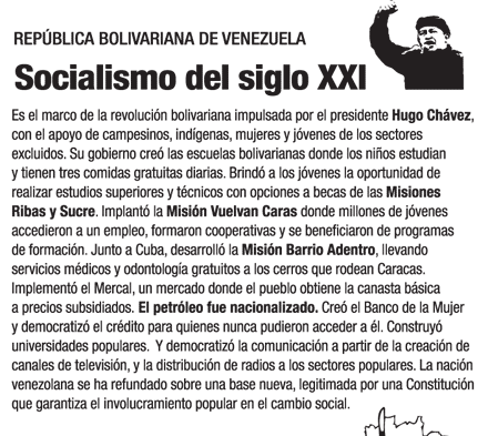 De la viñeta dedicada a Venezuela, en el diseño hay elementos, resaltados por negritas, acerca de la actuación del gobierno venezolano: las misiones y la nacionalización del petróleo.  Vayamos a las primeras. Entiendo que desde lejos se vea como positivo la implementación de politicas sociales dedicadas a los más pobres. Eso lo celebramos tambien en nuestro país. Lo que cuestionamos es la extensión de las mismas (si abarcan a toda la población pobre) y su perdurabilidad en el tiempo (sólo posible por la alta renta petrolera). Si bien la nota repite hechos ciertos (la existenia de las politicas sociales implementadas por el presidente Chávez), su redacción sugiere que han elevado significativamente la calidad de vida de los más desposeidos, y esto no es así.