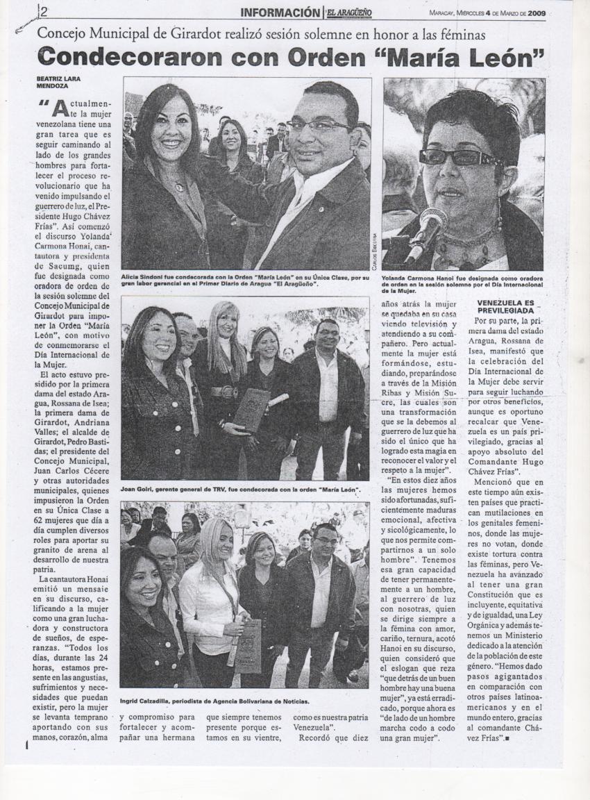 En estos dias de la larga noche, hay cosas que deben ser guardadas en el baul de la memoria abyecta. Como muestra del servilismo y el culto a la personalidad pasarán estas declaraciones, a propósito del Dia de la Mujer, en el que una antigua luchadora afirma que las componentes de su genero no son nada sino fuera por la figura del hombre a caballo, «el guerrero de la luz», el prócer caudillista e independentista de nuestro amargo siglo XXI. Por otra parte, no es detalle menor el nombre de la «orden» con la que premiaron la lealtad de algunas.