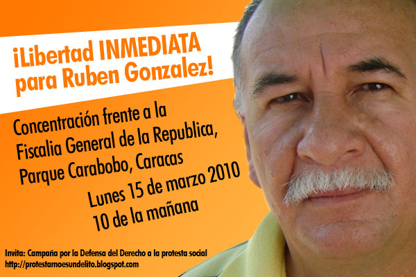 En el marco de la Campaña por el derecho a la protesta social se realizará una concentración frente a las oficinas de la Fiscalía General de la República, en Parque Carabobo – Caracas, para exigir la liberación inmediata del dirigente sindical Rubén González. Como se recordará, desde el pasado mes de agosto del 2009 este dirigente sindical de Ferrominera ha sido privado de su libertad por haber participado en una paralización de actividades en la defensa del contrato colectivo de los trabajadores. Actualmente, violando todas las garantías del debido proceso y el derecho a su defensa, se encuentra recluido en la sede de Patrulleros del Caroní, en el estado Bolívar, a la espera de juicio. Algunos de los delitos que se le imputan son violación de la zona de seguridad, agavillamiento, cierre de vías e instigación a delinquir, acusaciones que forman parte del andamiaje jurídico que cercena el derecho constitucional a la protesta, y que ha sido aplicado contra diferentes dirigentes sindicales, campesinos, estudiantes y comunidades que manifiestan en defensa de sus derechos.
