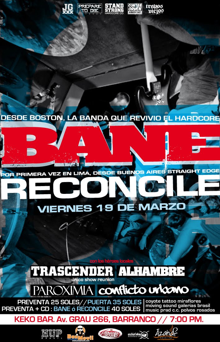 El 19 de marzo la banda Reconcile de Buenos Aires y Bane de Boston pisaron por primera vez un escenario en Perú. Los acompañaron algunas bandas locales y un entusiasta puñado de seguidores y seguidoras que sudaron a rabiar en el slam dancing.