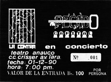 Entrada al concierto de la Contra y Pecado Capital, el 01 de diciembre de 1990. Primera vez -y última- que prestaron ese Teatro Anauco para un concierto de rock. Pecado Capital hacía un punk primitivo, remedando la gracia de bandas como Siniestro Total y los primeros Seguridad Social. La Contra, en cambio, estaba en sintonía con el boom del rock latino. Rudy, su cantante, hacia una pirueta al final del concierto para delicia de la muchachada. La entrada eran 100 bolívares.
