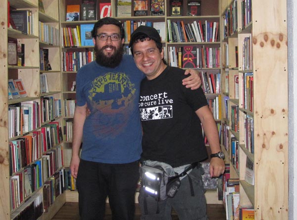 Con Pablo Abufóm, tanto tiempo escribiéndonos, tantos proyectos, mucho material que ha viajado de un lado a otro del continente. De Traidores distribución, revista Acción Directa, Librería Emma Goldman… Aca estamos en la Librería Proyección