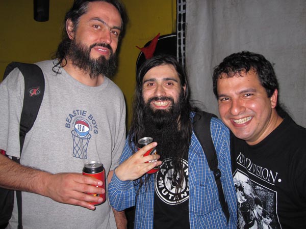 El de el medio es Stephens, el técnico de sonido y grabación por excelencia de la movida punk-hardcore Santiaguina. Ahora toca en malgobierno, miembro de Masapunk y coeditor del fanzine Crónica Negra. Espero pronto sacarle agunos secretos para el ingreso de bandas nóveles en las lides de la autograbación. Como si fuera poco, a su lado, Julio Cortés, bajista de la mítica banda «Disturbio Menor».