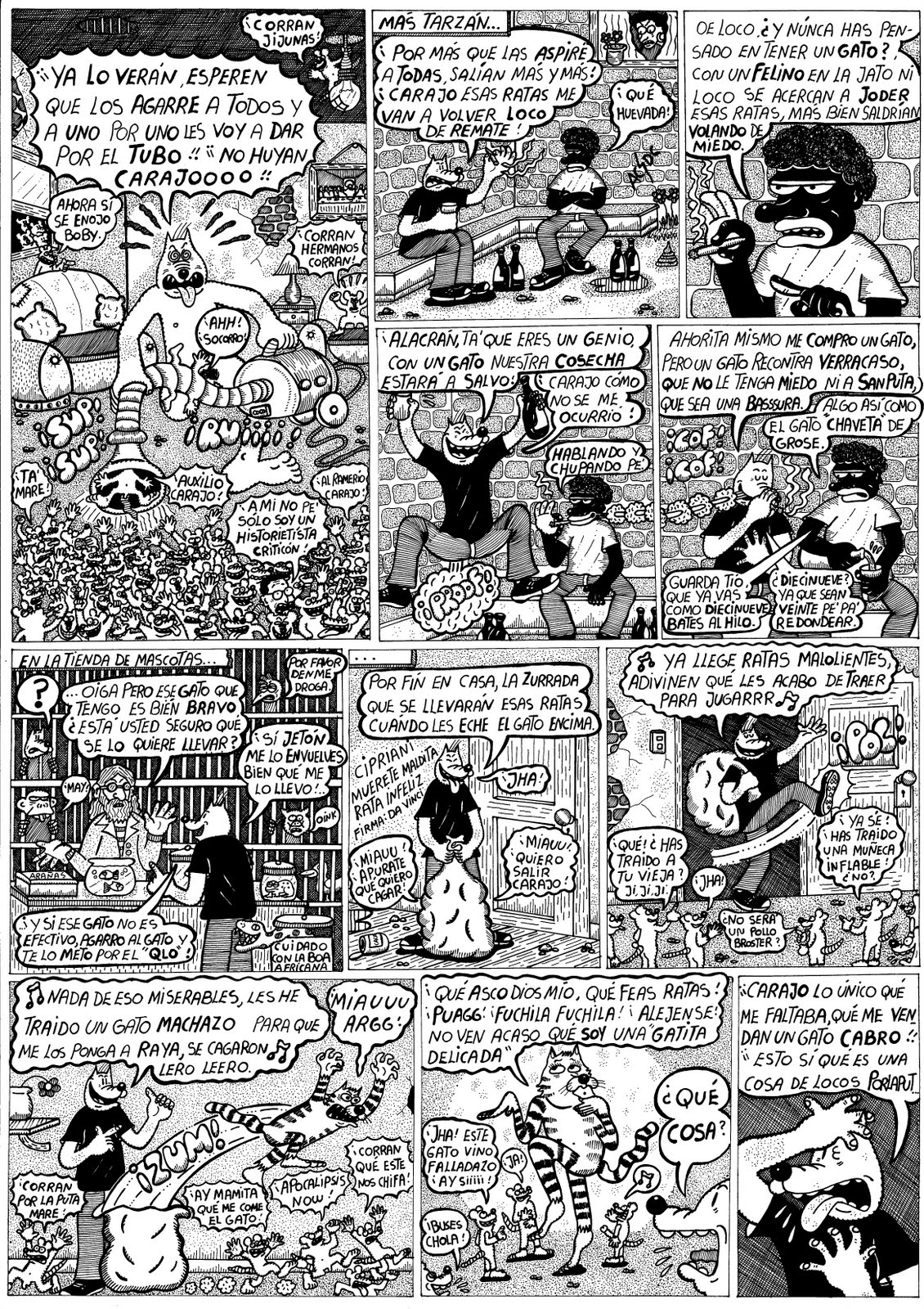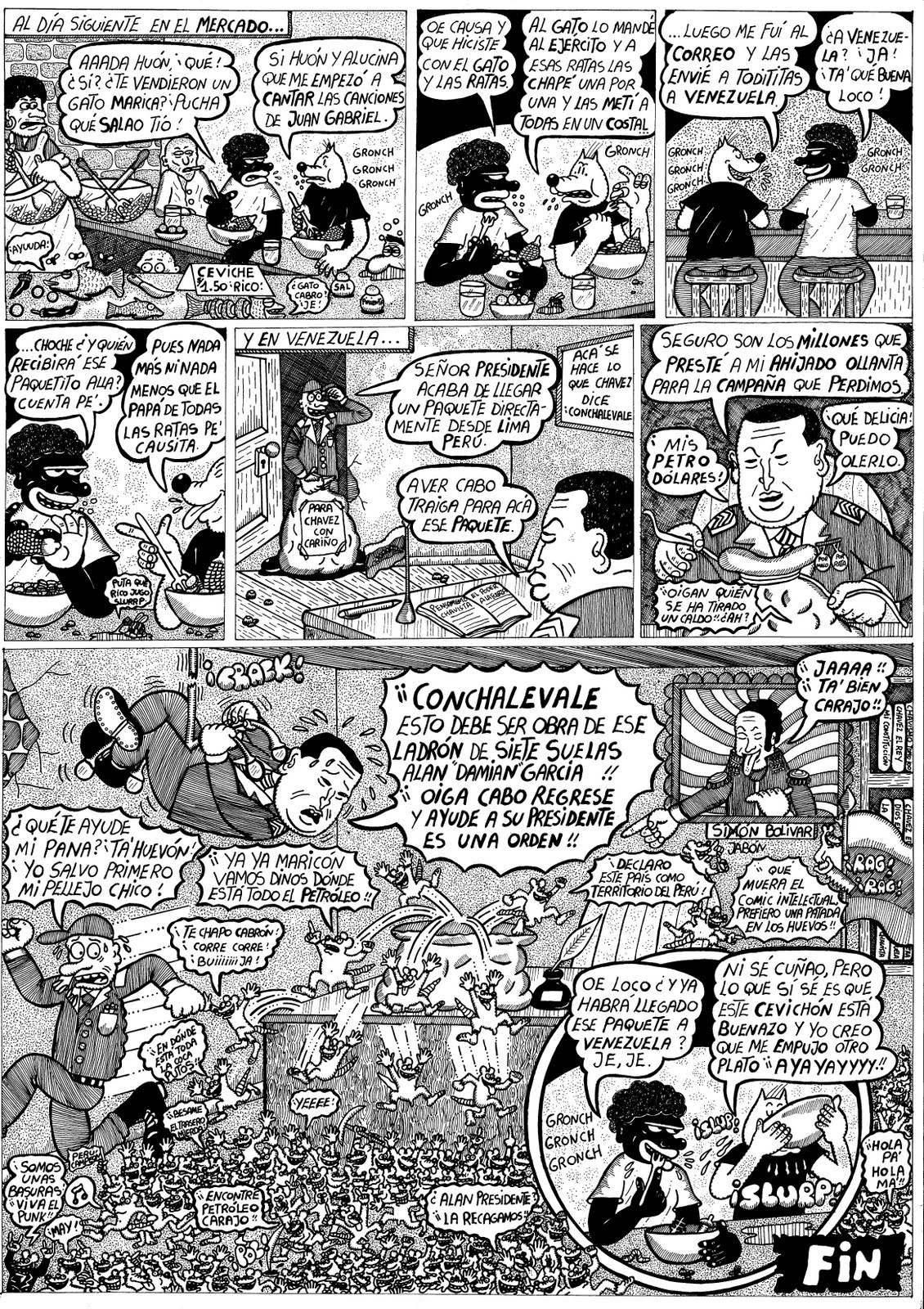 Un ejemplo lo puede constituir la visión de uno de los exponentes del comic underground peruano, a quien dificilmente le pudieran endilgar los adjetivos de oligarca y proimperialista con el que alegremente se despacha a quien disienta del bolivarianismo. David Galliquio ha desarrollado un personaje, llamado «Lito el perro«, en donde se resume la cultura urbana popular de lo que alguna vez fue Virreinato español y hoy es una urbe pujante y en crecimiento. En la agradable Librería Contracultura de la Avenida Larco, adquirí el libro que recopila alguna de las tiras del personaje, y me encontré con el capítulo que comparto a continuación.