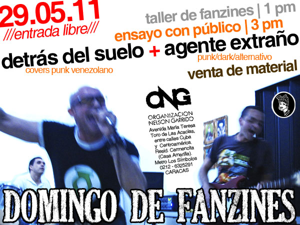 Este Domingo 29 de mayo del 2011, la Organización Nelson Garrido (ONG) de Caracas será sede de un nuevo domingo de fanzines, una actividad que mezcla la edición de publicaciones independientes con la música alternativa de la ciudad.2|| En esta oportunidad, el ensayo con público será de la banda «Detrás del suelo», una agrupación conformada por veteranos de la movida punk venezolana: Matias Garrido (ex vocalista de Toque de Queda), Douglas Alvarez (ex guitarrista de Depravación Moral), Cilou Alvarez (Bajo) y Roger Núñez (ex baterista de Deskarriados). La banda realiza versiones de los temas clásicos del punk criollo de todos los tiempos. Además estará acompañada del trío «Agente Extraño», una banda caraqueña nacida en octubre del 2010, después de un tiempo con el nombre «Prozac». Está Formada por Sacha Torres (batería), Ricardo Bermúdez (guitarra,coros) y Ernesto Rojas (Bajo y Voz), cultivando una mezcla de punk, dark y alternativo. Ambas bandas empezaran a las 3 de la tarde, puntualísimo. Si deseas conocer que hay detrás de esta idea de «ensayos con público», consultar ACA