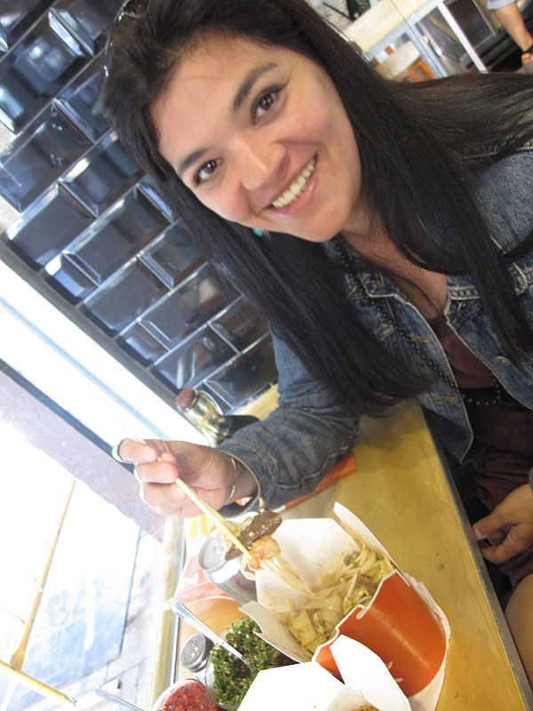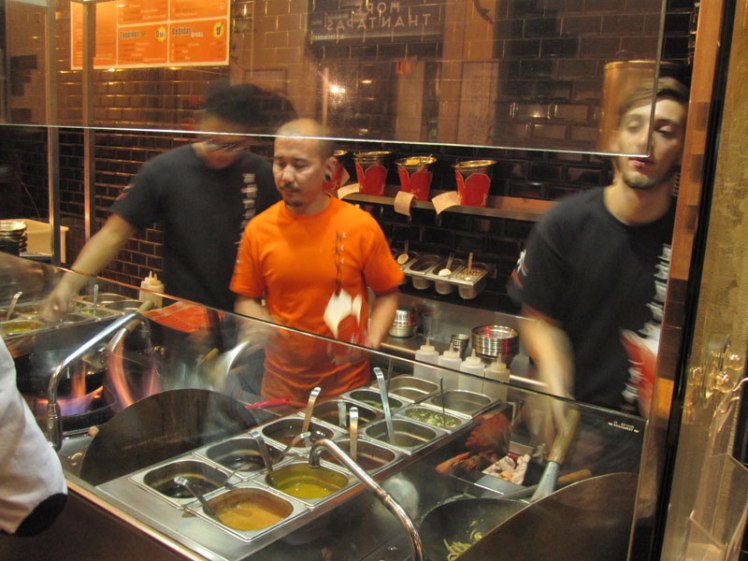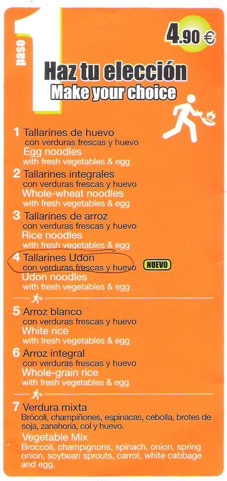 La franquicia tiene por nombre «Wok to Walk», y nos llamó la atención cuando salimos de La Boquería, por la larga fila de gente esperando turno. Algo pasaba allí. El diseño del lugar, a pesar de lo diminuto del sitio, era impecable con sus colores naranja, negro y verde, con una barra en donde se veían claramente a los cocineros en acción, en cuyo extremos estaba la cajera. La idea simple y poderosa. Se escoge una base de tallarines, que hay de varios tipos (huevo, integrales, arroz y udon), o arroz o verduras mixtas al vapor, lo que de partida suma 4.90 euros. Se escoge el tipo de acompañantes, que por ejemplo puede ser pollo, ternera, tocineta, champiñones o tiras de bambú, entre otros, cada uno sumando entre 1 y 2 euros por sabor. Si se desea se añade un «topping», a medio euro cada uno: cebolla frita (¡el mejor!), maní, cilantro o semillas de sésamo y, por último, salsas gratuitas para la combinación, algunas más picantes que otras. Pagas y al momento, uno de los cocineros prepara tu pedido en un gran wok, mientras deleitas la vista y el olfato en el proceso. Las bebidas cuestan razonablemente euro y medio (Y esto es muy importante porque en Barcelona sobran los sitios con menús «baratos» que luego se encarecen porque te cobran cada bebida a cinco euros) y aunque la idea es que sea un plato para llevar, hay sitio en el local para sentarse y comerlo al momento, recién salido del wok. Para nosotros amantes de la cocina oriental era un festín a un buen precio, pues la porción era la suficiente para quedar satisfecho.