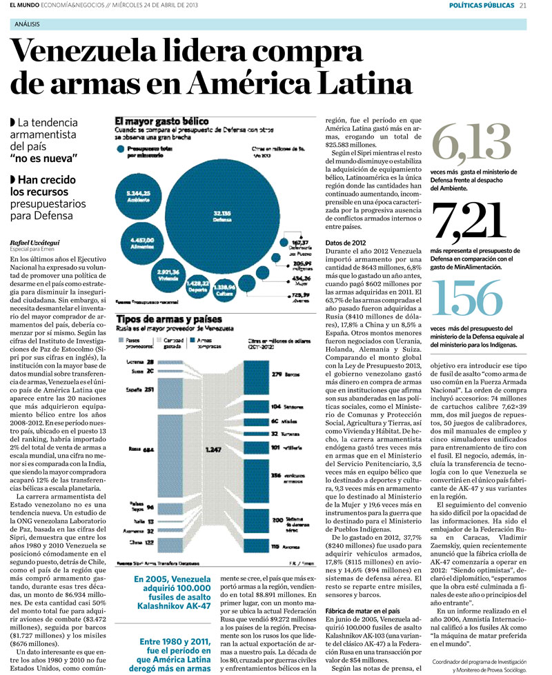 En los últimos años el Ejecutivo Nacional ha expresado su voluntad de promover una política de desarme en el país como estrategia para disminuir la inseguridad ciudadana. Sin embargo, si necesita desmantelar el inventario del mayor comprador de armamentos del país, debería comenzar por sí mismo. Según las cifras del Instituto de Investigaciones de Paz de Estocolmo (Sipri por sus cifras en inglés), la institución con la mayor base de datos mundial sobre transferencia de armas, Venezuela es el único país de América Latina que aparece entre las 20 naciones que más adquirieron equipamiento bélico entre los años 2008-2012. En ese período nuestro país, ubicado en el puesto 13 del ranking, habría importado el 2% del total de venta de armas a nivel mundial, una cifra no menor si es comparada con la India, que siendo la mayor compradora acaparó el 12% de las transferencias bélicas a nivel planetario.