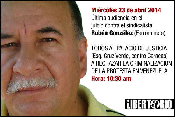 El próximo miércoles 23 de abril está pautado en la ciudad de Caracas la última audiencia del juicio contra el Secretario General de Ferrominera Rubén González. ¿Su delito? Haberse puesto del lado de los trabajadores en sus luchas.