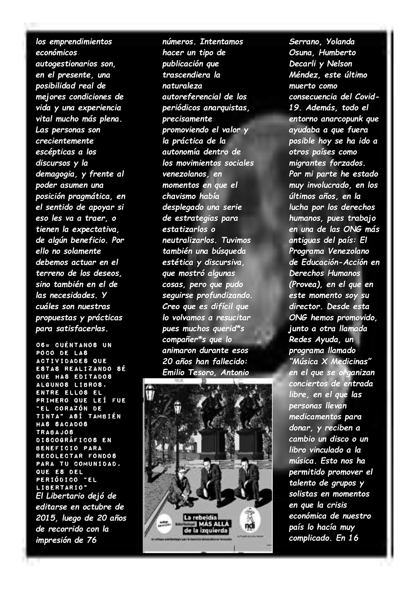 El Libertario dejó de editarse en octubre de 2015, luego de 20 años de recorrido con la impresión de 76 números. Intentamos hacer un tipo de publicación que trascendiera la naturaleza autoreferencial de los periódicos anarquistas, precisamente promoviendo el valor y la práctica de la autonomía dentro de los movimientos sociales venezolanos, en momentos en que el chavismo había desplegado una serie de estrategias para estatizarlos o neutralizarlos. Tuvimos también una búsqueda estética y discursiva, que mostró algunas cosas, pero que pudo seguirse profundizando. Creo que es difícil que lo volvamos a resucitar pues muchos querids compañers que lo animaron durante esos 20 años han fallecido: Emilio Tesoro, Antonio Serrano, Yolanda Osuna, Humberto Decarli y Nelson Méndez, este último muerto como consecuencia del Covid-19. Además, todo el entorno anarcopunk que ayudaba a que fuera posible hoy se ha ido a otros países como migrantes forzados. Por mi parte he estado muy involucrado, en los últimos años, en la lucha por los derechos humanos, pues trabajo en una de las ONG más antiguas del país: El Programa Venezolano de Educación-Acción en Derechos Humanos (Provea), en el que en este momento soy su director. Desde esta ONG hemos promovido, junto a otra llamada Redes Ayuda, un programa llamado “Música X Medicinas” en el que se organizan conciertos de entrada libre, en el que las personas llevan medicamentos para donar, y reciben a cambio un disco o un libro vinculado a la música. Esto nos ha permitido promover el talento de grupos y solistas en momentos en que la crisis económica de nuestro país lo hacía muy complicado. En 16 conciertos en varias ciudades, se han recaudado más de 20.000 cajas de medicamentos, además de insumos médicos, que son distribuidos de manera gratuita a quienes los necesitan. Las versiones digitales de los discos de Música X Medicinas se pueden descargar de https://humanoderechorecords.bandcamp.com/. Sobre los libros, en el 2010 tuve la suerte de editar, en tres idiomas diferentes, “Venezuela: la revolución como espectáculo. Una crítica anarquista al gobierno bolivariano”. Y en julio de 2021, que ha sido el último, “La rebeldía más allá de la izquierda. Un enfoque postideológico para la transición democrática en Venezuela”, ambos de manera independiente.