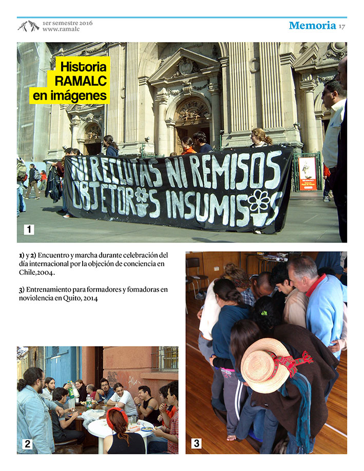 Desde hace un tiempo soy parte del movimiento antimilitarista internacional. En la Red de América Latina y el Caribe (RAMALC), nos propusimos tener una publicación, asi que forme parte del consejo editorial del primer número. Mi responsabilidad fue diseñar y diagramar el primer número, para lo cual me inspiré en la revista ibérica «La Marea«.