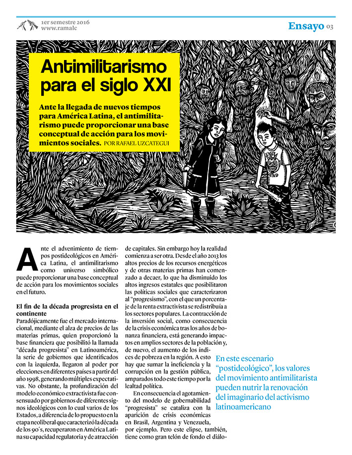 Desde hace un tiempo soy parte del movimiento antimilitarista internacional. En la Red de América Latina y el Caribe (RAMALC), nos propusimos tener una publicación, asi que forme parte del consejo editorial del primer número. Mi responsabilidad fue diseñar y diagramar el primer número, para lo cual me inspiré en la revista ibérica «La Marea«.