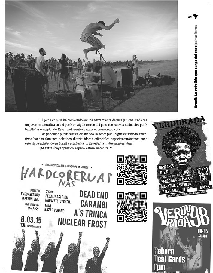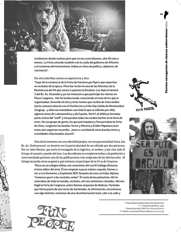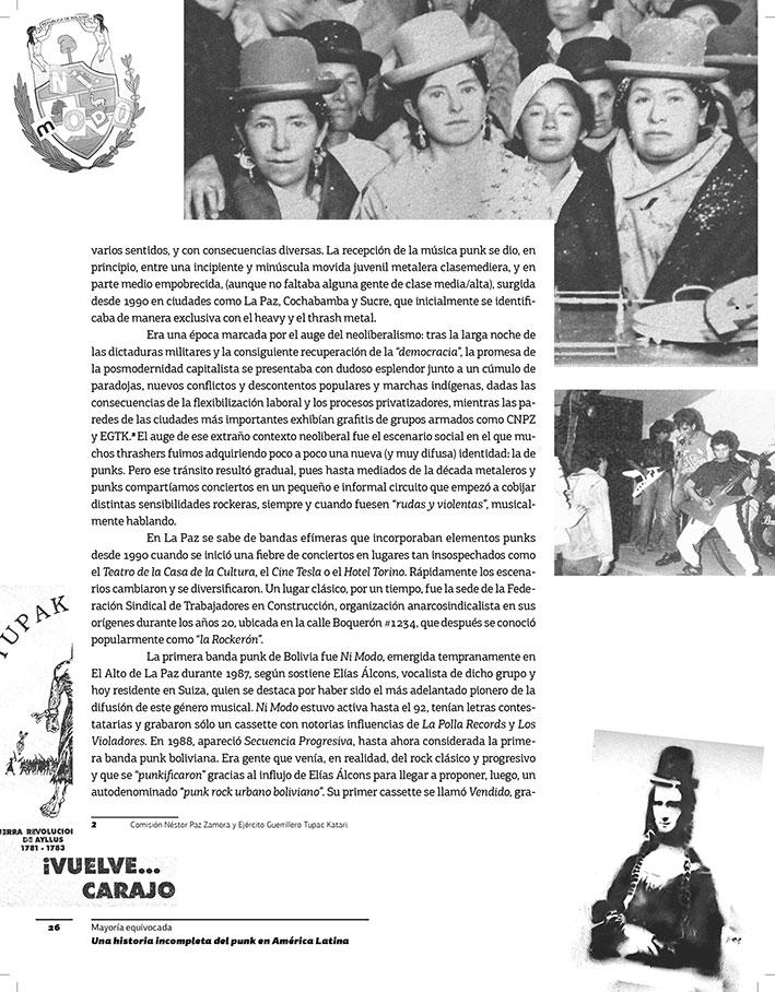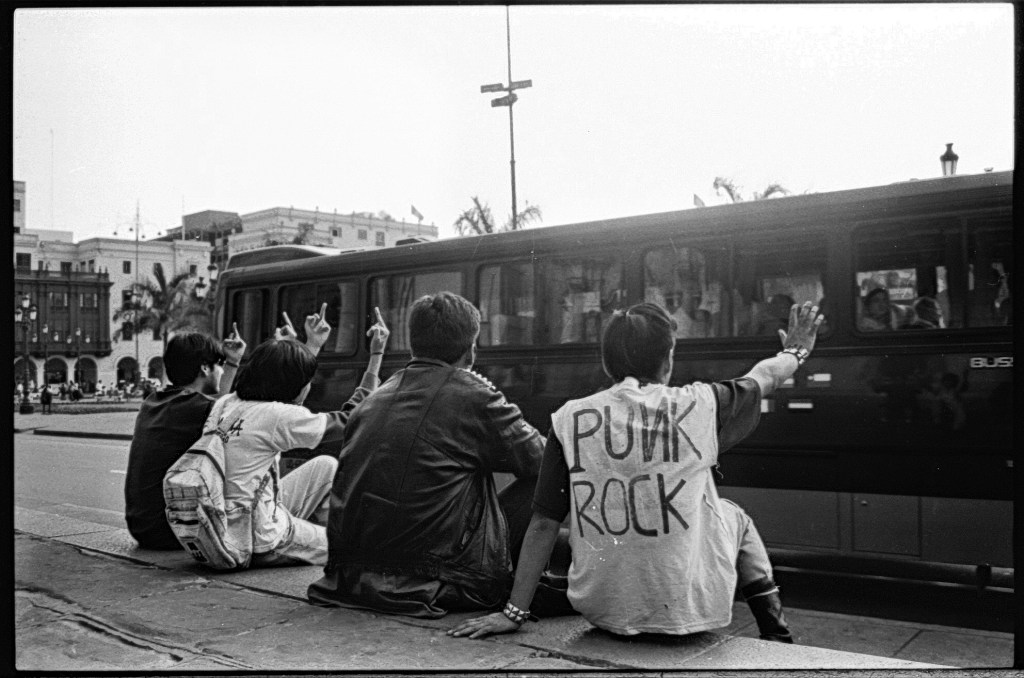 Decisiones editoriales: Si los protagonistas eran de América Latina, no se publicarían fotos de músicos o activistas de otras latitudes, que bastantes libros tienen. Una excepción: La foto de Aknez (Massacre 68) cantando con Evaristo Páramos de La Polla Records. La única foto a doble página, por los histórica, fue la de Los Prisioneros cantando en un concierto por el «No» en el referendo a Pinochet. Para la portada revisamos, una y otra vez, bancos de imágenes propios y ajenos para encontrar una indicada: El fenómeno había sido adaptado y no era una simple copia de lo ocurrido en Londres o Estados Unidos. Por fin dimos con una que nos voló la cabeza, de Tunchi del Colectivo Lima Foto Libre. El mismo tuvo la gentileza de mandarnos un video explicando su contexto.