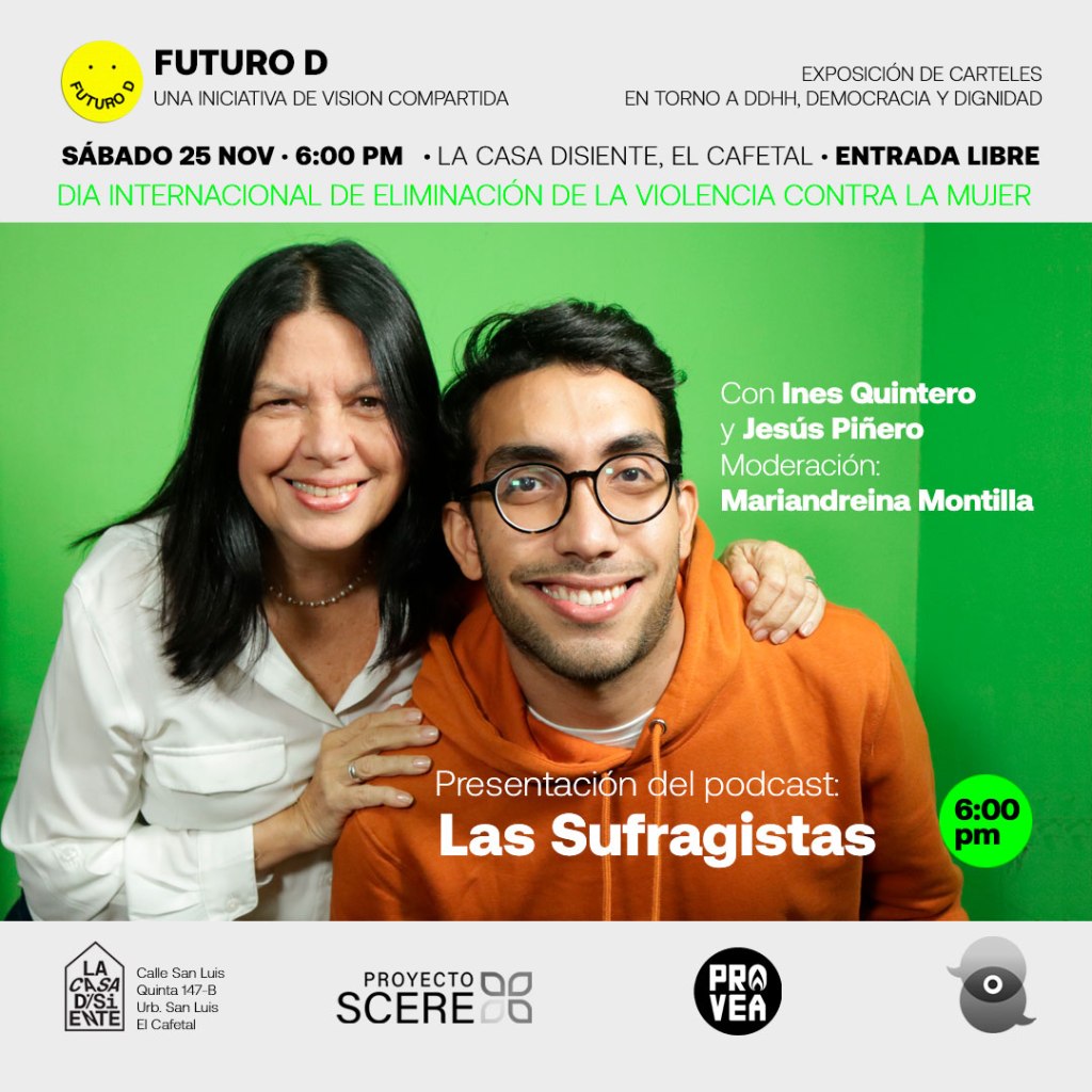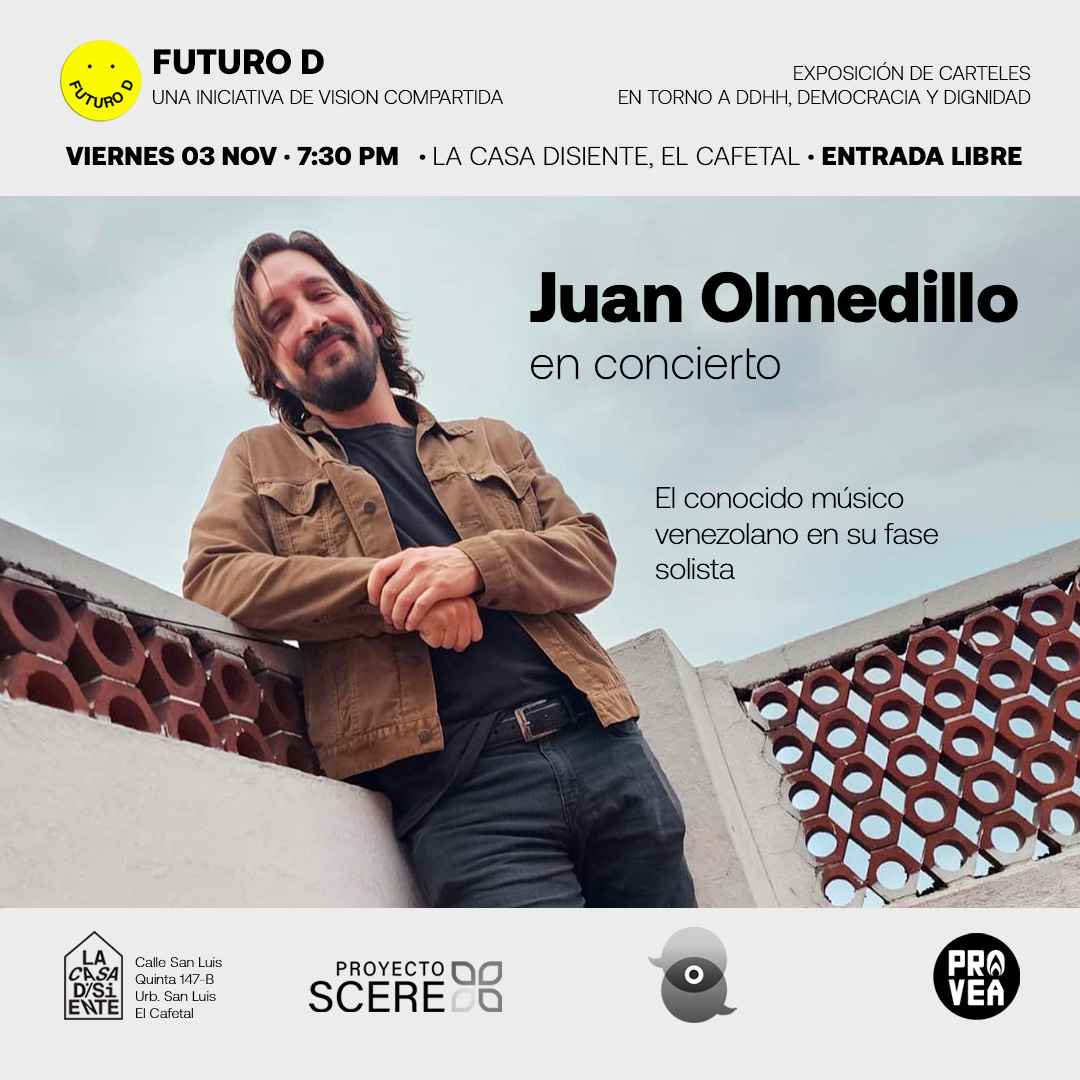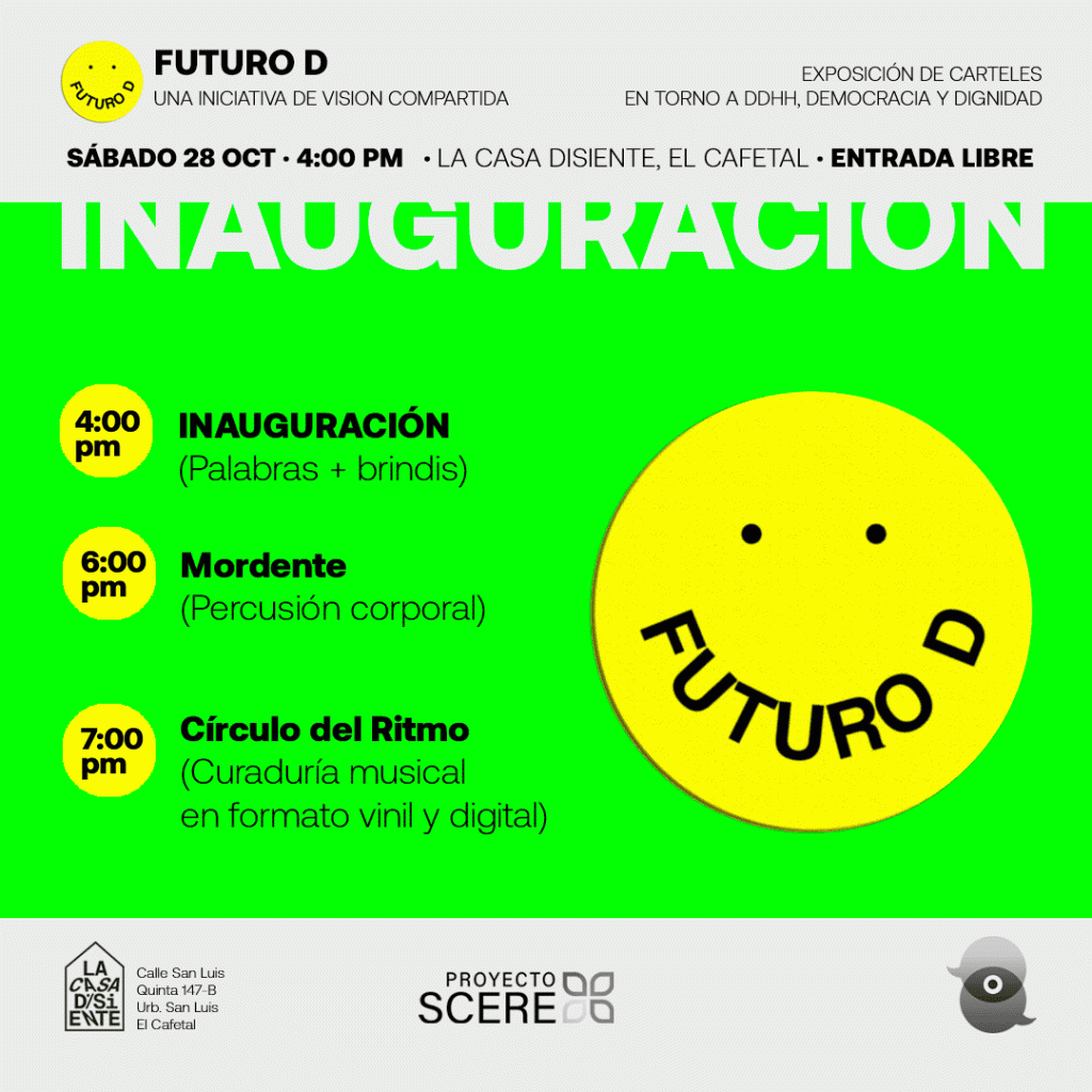 «Visión Compartida» ha sido un proyecto promovido por las ONG Civilis DDHH y Provea, con el apoyo de WOLA, para construir una mirada sobre la Venezuela posible, desde una perspectiva de derechos humanos, con la participación de diferentes organizaciones del país. Luego de encuentros y discusiones realizadas durante dos años, las conclusiones de las diferentes mesas temáticas fueron plasmadas en diferentes documentos, diagramados por este servidor, según el estilo definido por Abraham Araujo para la muestra «Futuro D». Por su parte, Futuro D fue una muestra de carteles en la que diferentes artistas emergentes del país reflejaron plásticamente el contenido de las diferentes areas, y que fueron expuestos durante varias semanas de octubre, noviembre y diciembre del 2023 en la Casa Disiente de Caracas. Los flyers también fueron diagramados por Rafael Uzcátegui, dándole coherencia estética al conjunto de productos emanados de Visión Compartida.